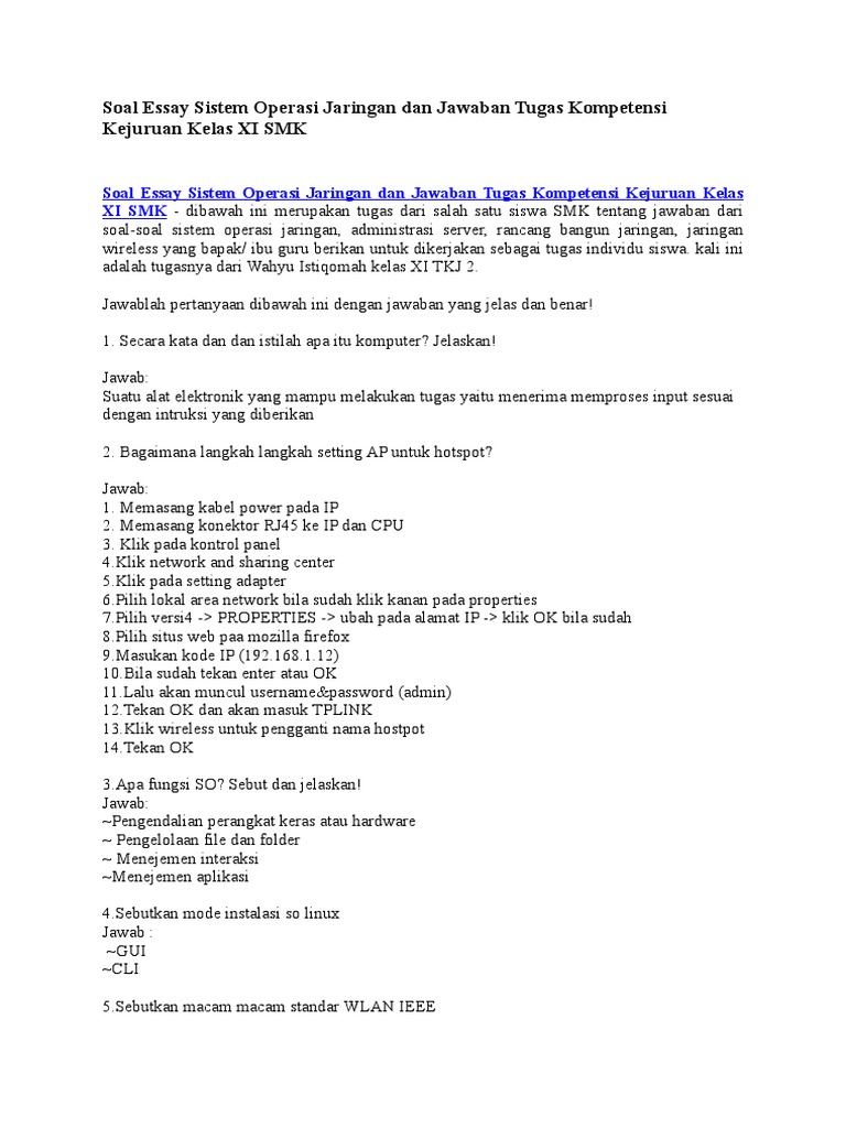 Soal Essay Sistem Operasi Jaringan Dan Jawaban Tugas Kompetensi Kejuruan Kelas Xi Smk Pdf
