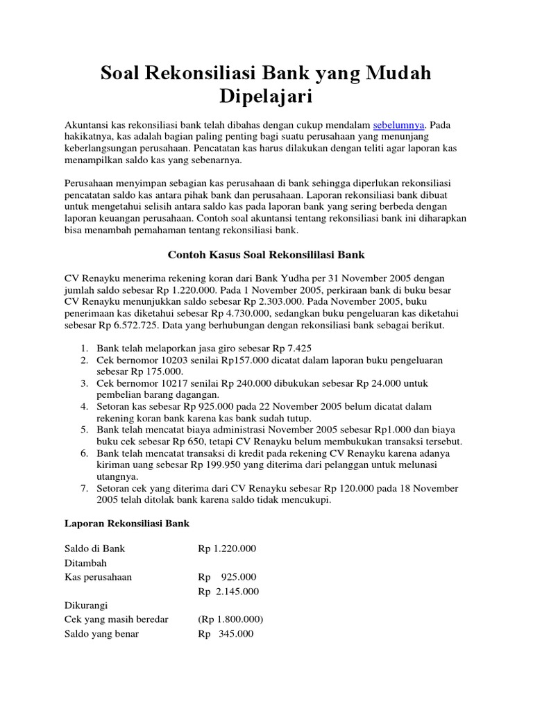 Doc Jawaban Kas Bank Imelda Dyah W Academiaedu. Rekonsiliasi bank adalah suatu kewajiban yang dilakukan perusahaan dalam mencara sebab-sebab ketidaksamaan antara saldo simpanan menurut Demikianlah penjelasan tentang Rekonsiliasi Bank. Doc Contoh Soal Dasar Akuntansi Perusahaan Manufaktur Henny Gulo Academia Edu.